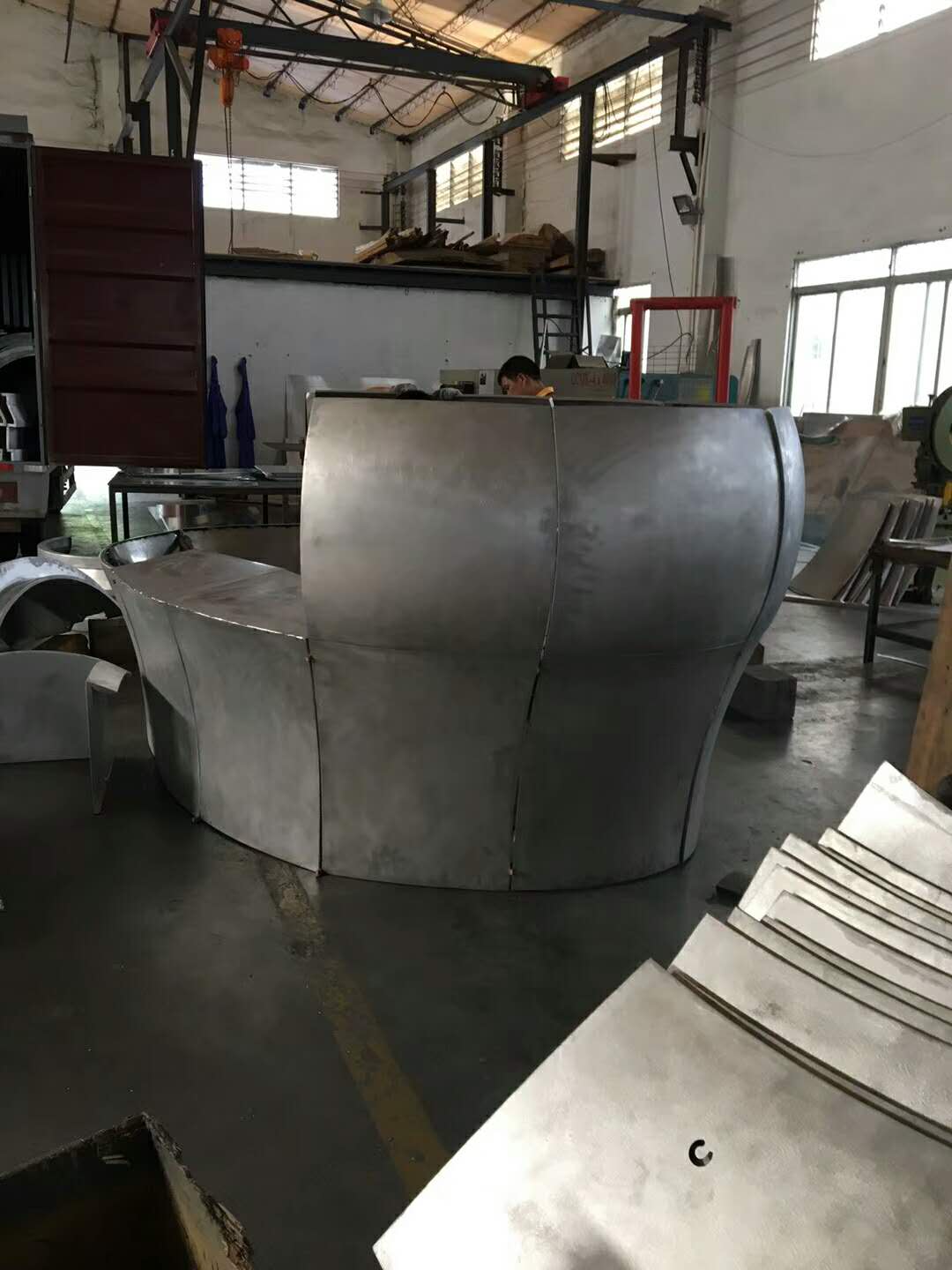 拼密焊接——→板背種釘——→焊位打磨——→裝加強筋——→精細拋光