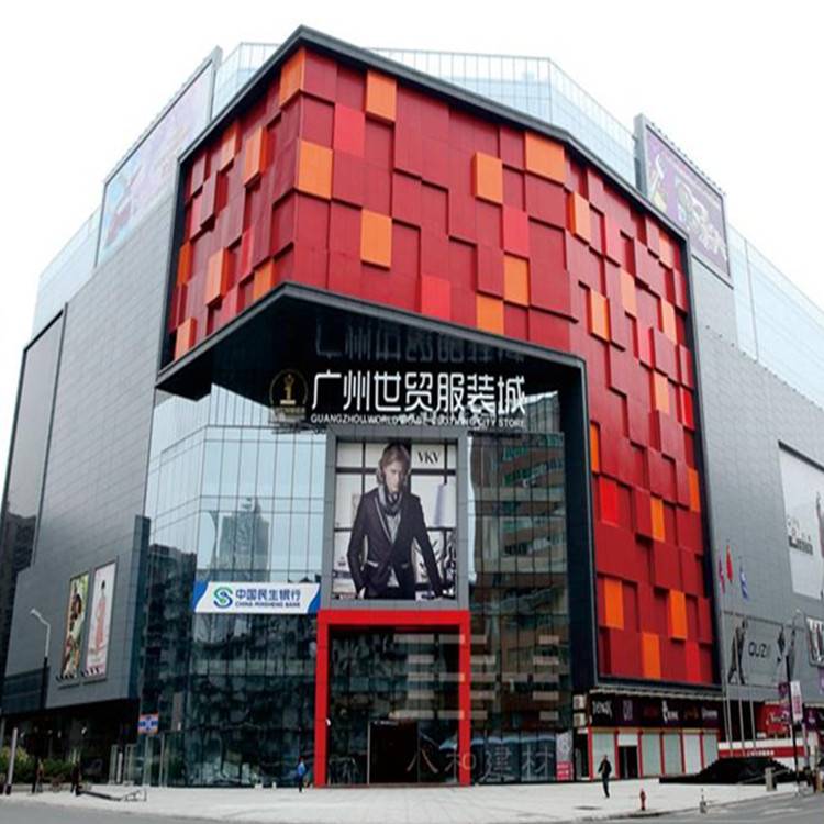 廣州世貿(mào)服裝城位于越秀區(qū)站南路16號(hào)白馬商貿(mào)大廈2層,外墻裝飾采用了鋁單板幕墻、外墻氟碳鋁單板、氟碳鋁單板幕墻、紅色外墻鋁單板、橙色鋁單板幕墻、氟碳門(mén)頭鋁單板幕墻、銀灰色鋁單板幕墻。